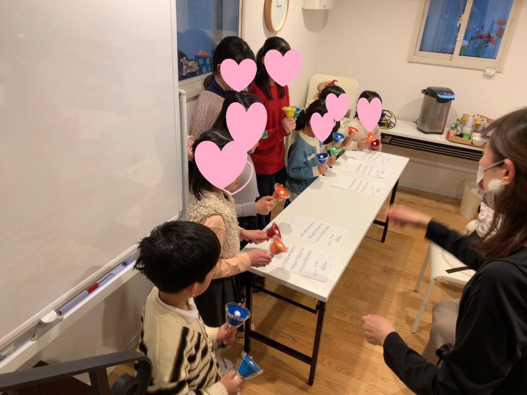 クリスマスクイズ勝ち抜き戦も盛り上がり、後半はノルウェーワッフルをその場で焼いてお茶会。プレゼントはレッスンで使える5線がかけるペンと鍵盤柄のペンケース。次のレッスンに早速持ってきた生徒もいました!