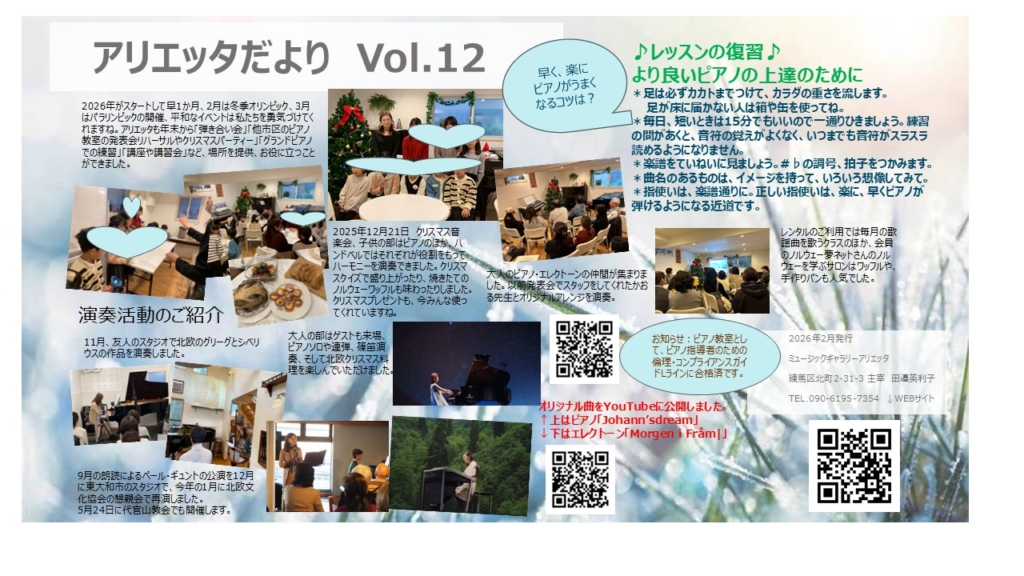 ピアノの生徒さんたちや、レンタルご利用の皆様に向けたアリエッタだより(不定期)を発行しました。レッスンの復習ポイントや年末からの音楽活動などをまとめました。アリエッタだよりのほかには、生徒さん&ご家族に子供向けのコンサートやお薦めのものを、時々チラシをお渡しして紹介しています。ピアノのほかにオーケストラやソロ、室内楽を聴く機会が増えるといいと思います。おうちでCDや動画でもいろいろな音楽を聴いてほしいのはもちろんですが、生演奏で心に何か感じてくれることを願っています。